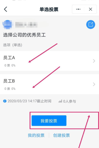 打开钉钉投票小程序,如图,点击【新建投票】,输入投票主题(例如选出公司优秀员工),设置相关选项,点击【创建投票】,