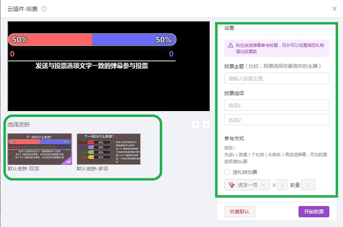 2、弹出投票窗口,用户按照自身需要对投票主题、投票选项、参与方式、选择皮肤等进行设置。设置完毕,点击【开始投票】。