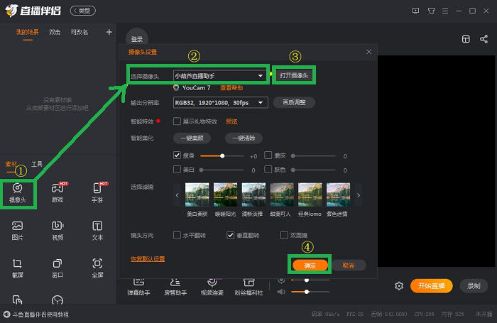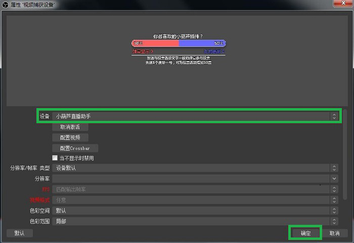 4、在设备后选择【小葫芦直播助手】,然后点击确定。