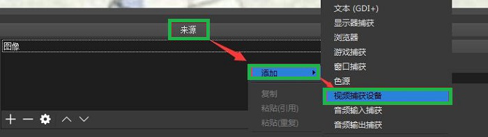 在直播主界面【来源】下方右击,在右击下拉菜单中依次选择【来源】—【视频捕获设备】。