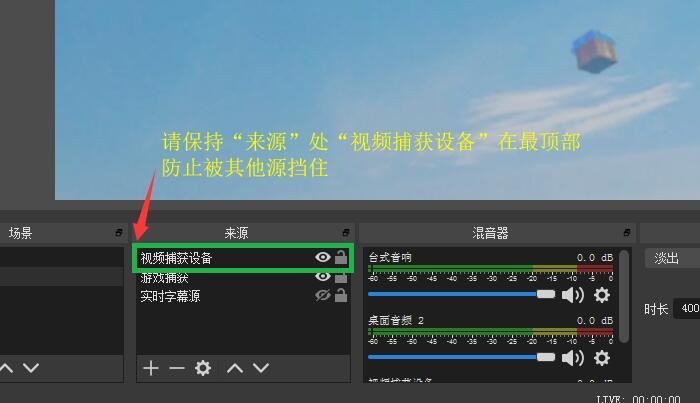 5、保持【视频捕获设备】在列表最顶处,以免被其他源视频挡住。