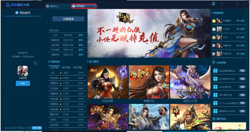 1、打开手机大师模拟器,登录如图界面。可以看到手机模拟大师有游戏中心和网页中心两个选项。喜欢游戏的用户可以点开看一下。