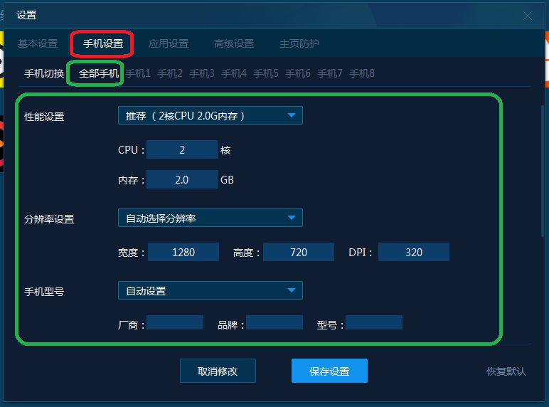 3、弹出设置窗口,点击最上方【手机设置】,可以看到在其下方出现手机切换、全部手机、手机1—手机8这三类选项。也就是说该软件可以支持8开,可以分别设置不同型号的手机,也可以统一在全部手机中设置。