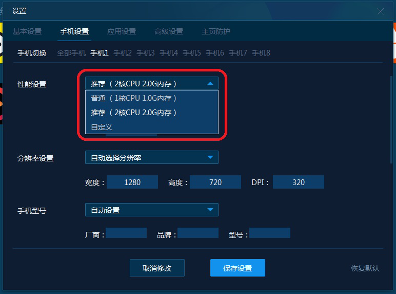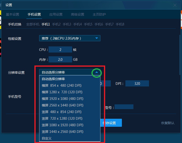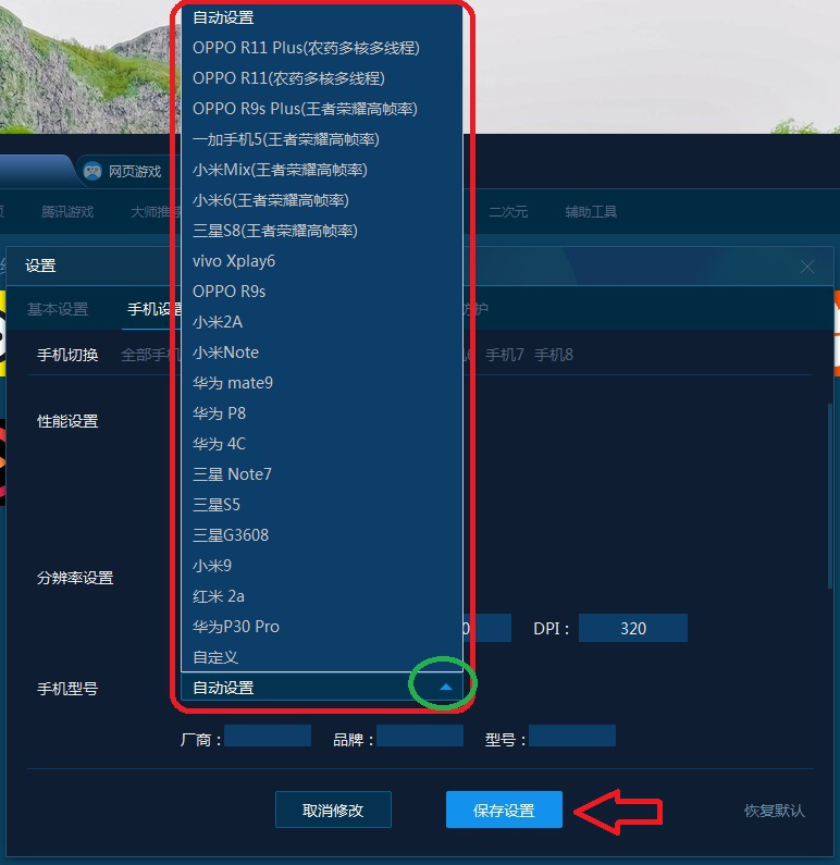 3)手机型号如图,用户可以选择模拟器模拟的手机型号。选择完成后点击【保存设置】。