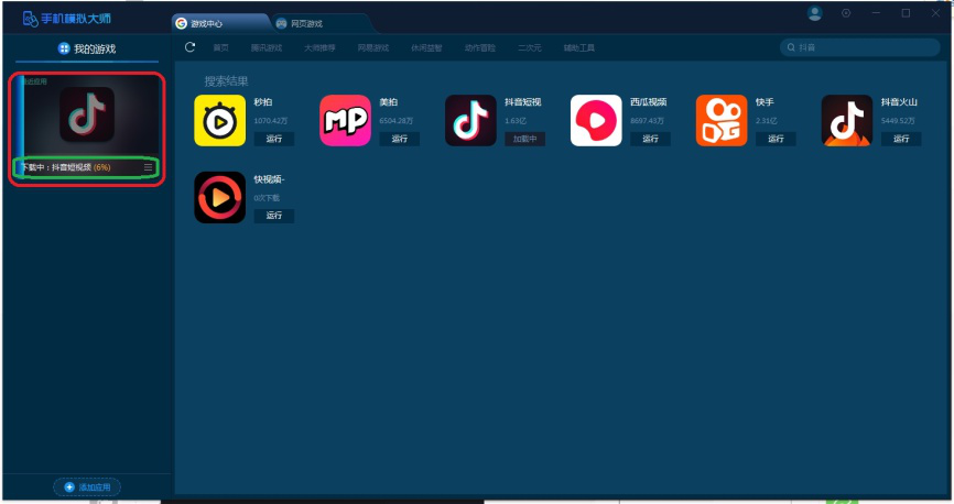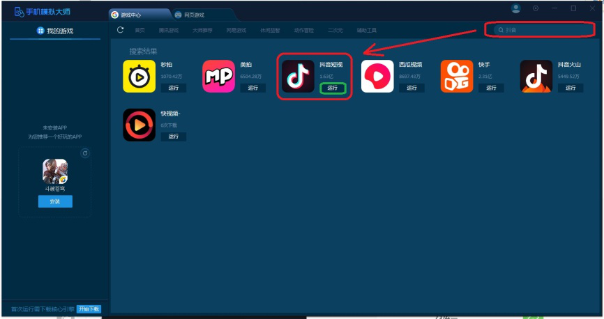 5、在右上方文本框内输入要添加的手机应用名称然后搜索(这里以抖音为例),找到目标应用,点击【运行】。