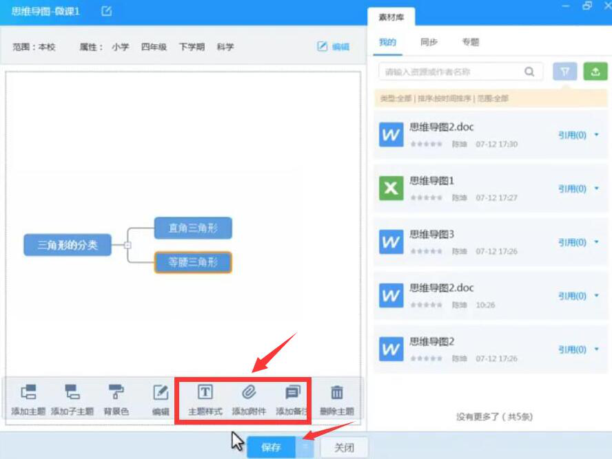 4、此外,老师可以点击工具栏中的“添加附件”、“添加备注”来对某个主题加以进一步的说明,也可以点击“主题样式”来美化主题,之后,点击“保存”按钮。