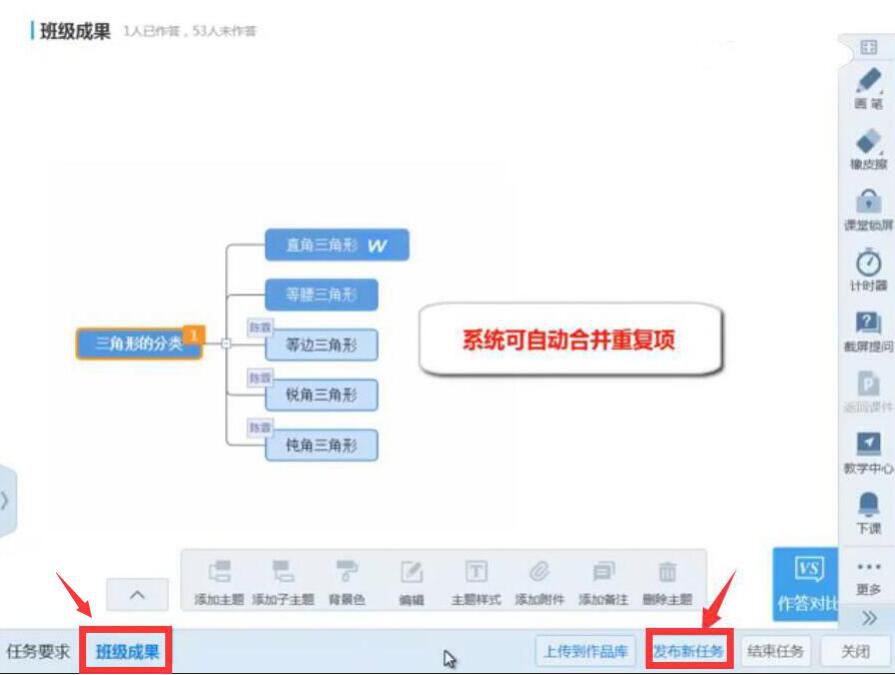 8、最后,老师在“班级成果”中,可看到学生的作答情况。点击“作答对比”来了解学生制作的区别;点击“发布新任务”按钮即可将师生合作完成的最终版本AiClass思维导图发至班上学生。