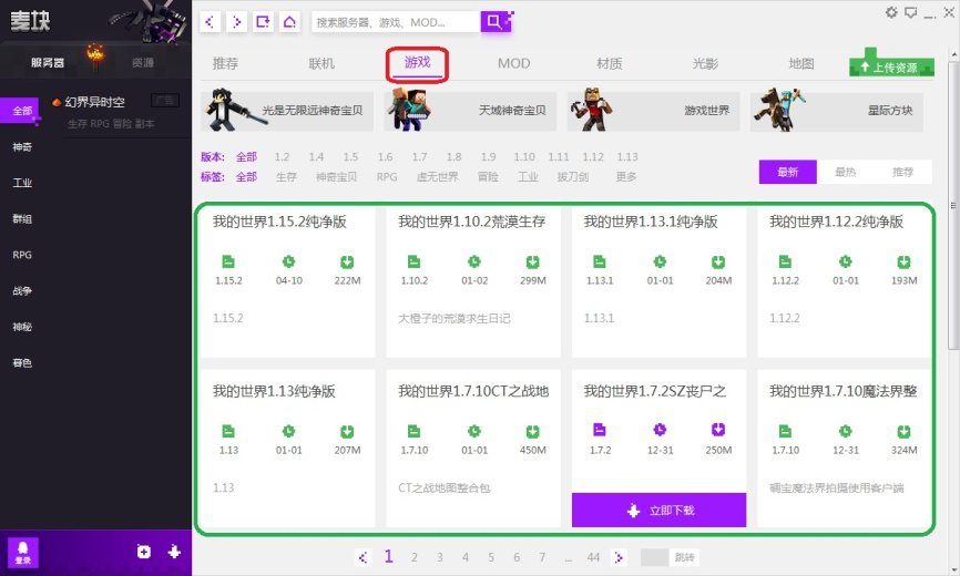 2、点击上方【游戏】选项,下方界面提供了“我的世界”这款游戏的各种版本,用户可以将鼠标放在需要下载版本上面,点击【立即下载】。如果不需要,忽略这一步。