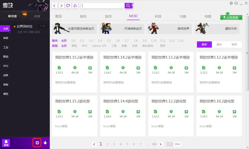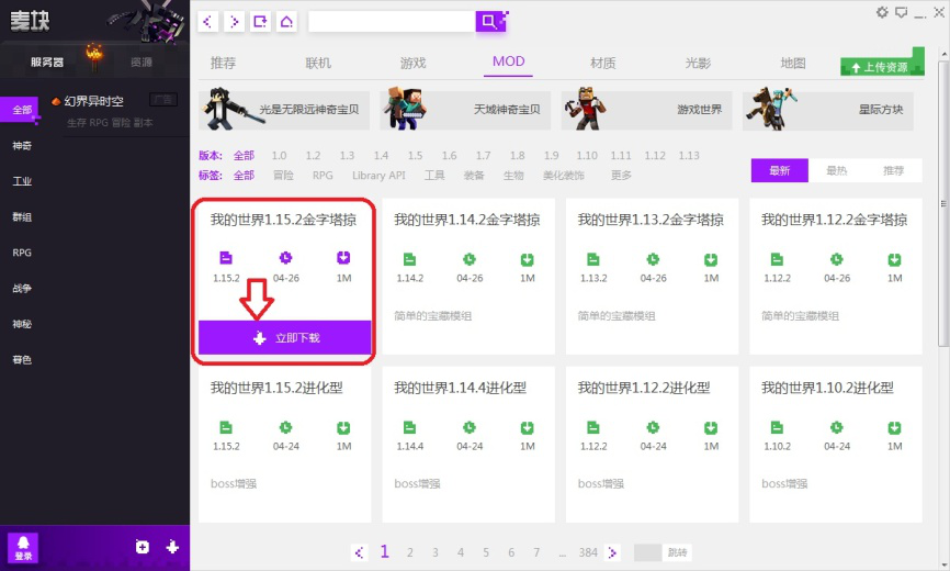 3、点击上方【MOD】选项。麦块在这里提供了各种各样的MOD,用户可以根据需要选取。也可以通过上方搜索栏搜索需要的MOD版本。