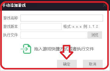 6、弹出手动添加游戏界面,通过浏览或拖拽将需要添加MOD游戏添加到麦块中,点击【确定】。