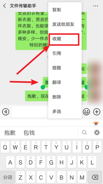 发送成功,长按一条快捷回复语,弹出选项,点击【收藏】,然后逐一收藏其他短语,
