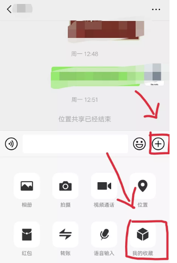 收藏成功,随意点击一个微信好友,进入聊天窗口,点击【+】,选择【我的收藏】,