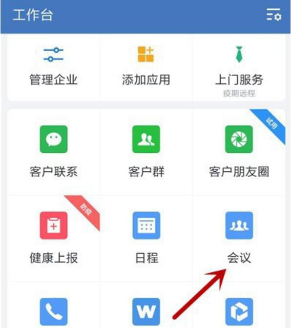 2、然后,在工作台向导页中,点击“会议”功能。