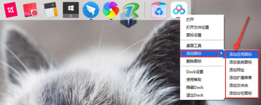 4、接下来,右键单击Dock窗口,在其菜单中,点击“添加图标”中的“添加应用图标”。