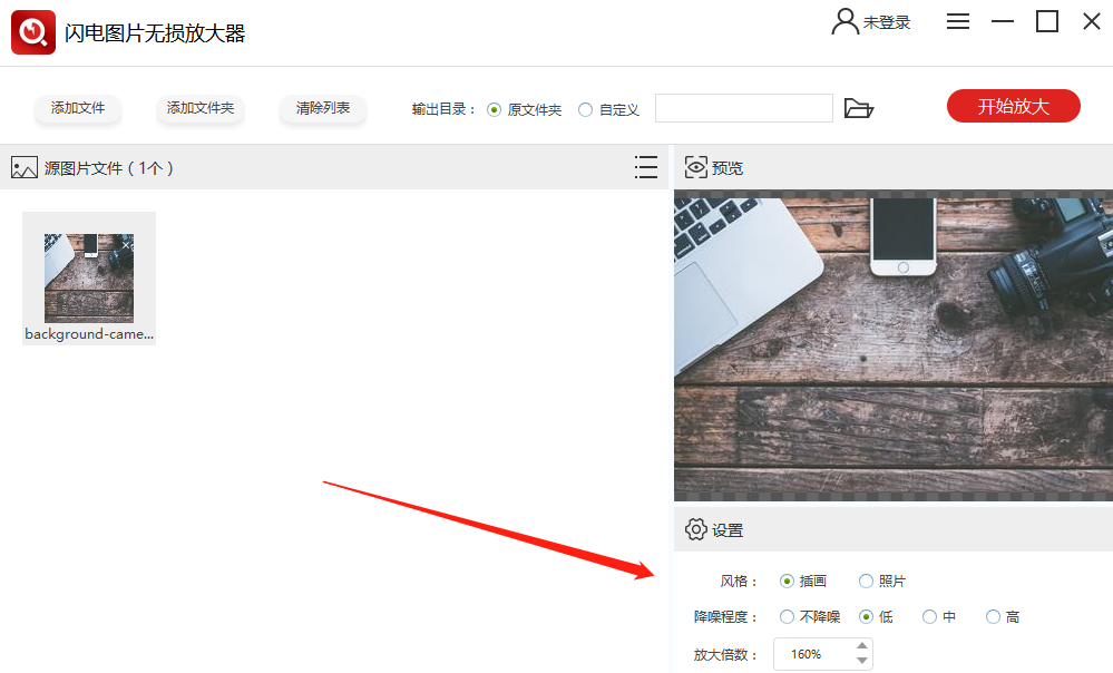 图片上传成功,在右侧窗口中进行相关设置,选择图片风格、降噪程度以及放大倍数,