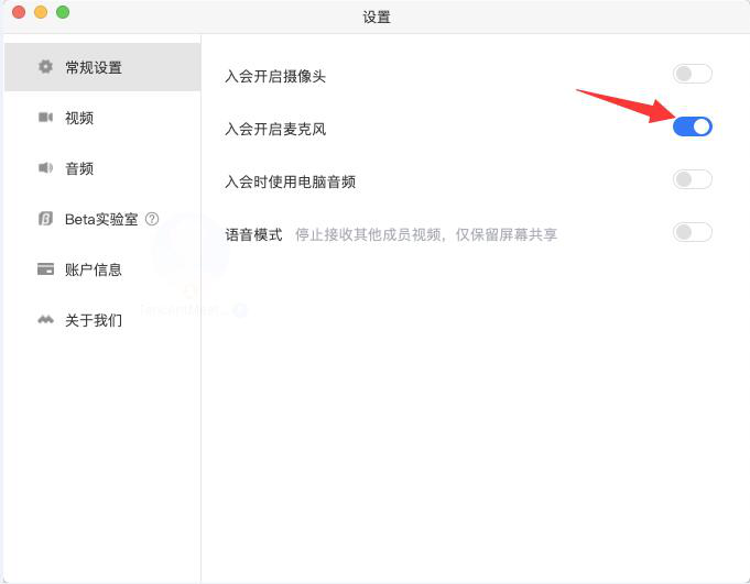 3、接下来,在腾讯会议电脑版的设置界面中,可以看到“入会开启麦克风”默认是开启的。用户将它关闭,即可关闭腾讯会议电脑版的麦克风。