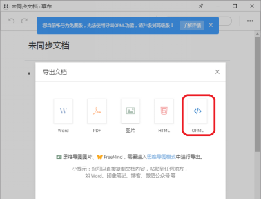 3、弹出“导出文档”窗口,选择【OPML】,将未同步文档导出为OPML格式保存至桌面或硬盘。