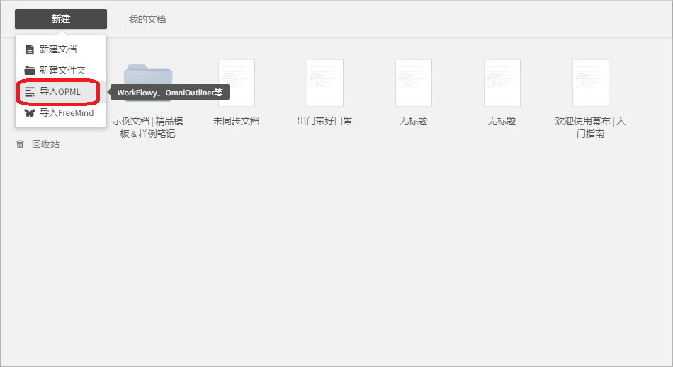 9、打开幕布笔记客户端,点击【新建】,然后选择【导入OMPL】。