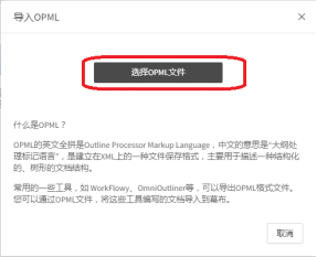 10、弹出导入OMPL对话窗,点击【选择OMPL文件】选项,选择之前保存的OPML格式的未同步文档,完成导入。