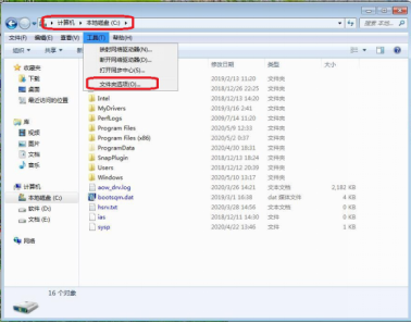 那么依次打开计算机-本地磁盘(C),点击界面上方【工具】,选择下拉菜单中【文件夹选项】。