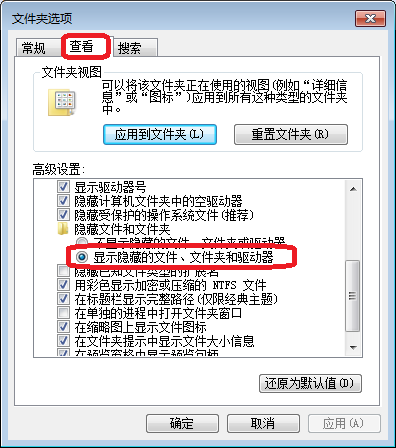3、弹出“文件夹选项”窗口,选择【查看】,在“高级设置”下方列表中勾选“显示隐藏的文件、文件夹...”,然后点击【应用】。