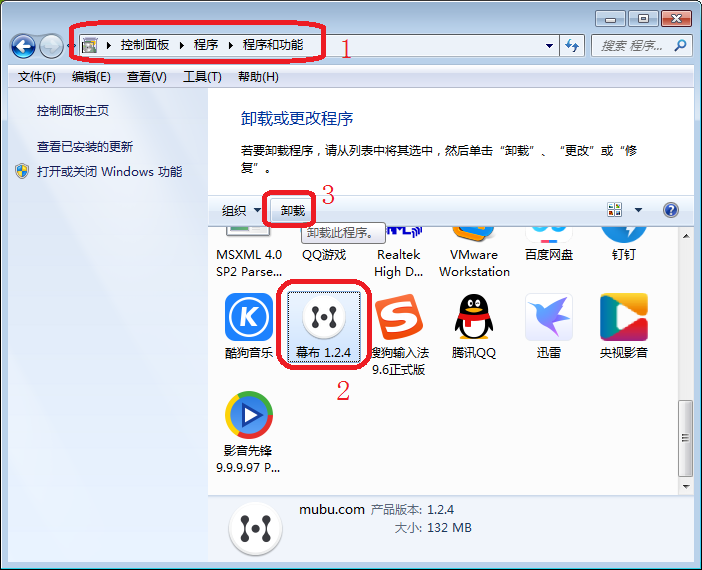 6、依次点击【控制面板】-【卸载程序】,进入如图界面,选择幕布软件,点击【卸载】。
