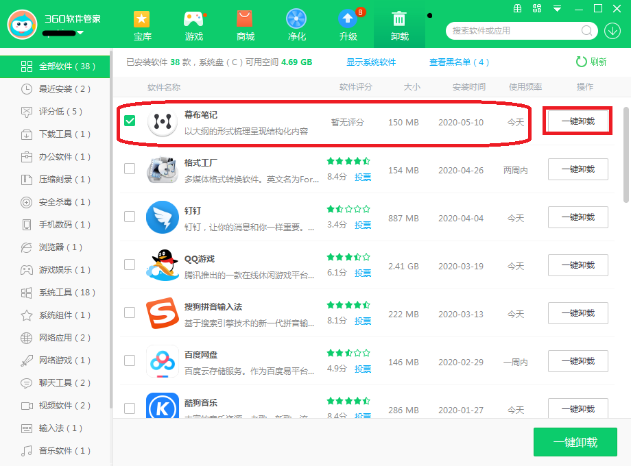 或者借助第三方软件如360安全卫士将幕布笔记软件卸载。