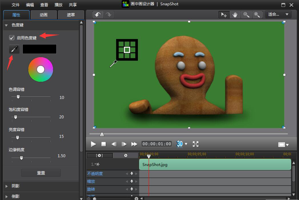 4、随后,进入威力导演的“画中画设计器”界面。在此界面中,用户想要换视频背景,就勾选“启用色度键”。点击如下图的滴管按钮,从视频片段中选择想要更换的背景。