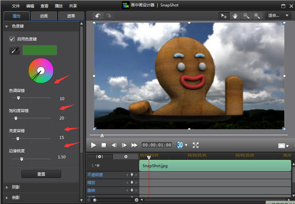 6、此时,用户就可以威力导演已经换了视频背景。但为了让效果更逼真自然,我们一般还会调整色调容错、饱和度、亮度、边缘锐度。