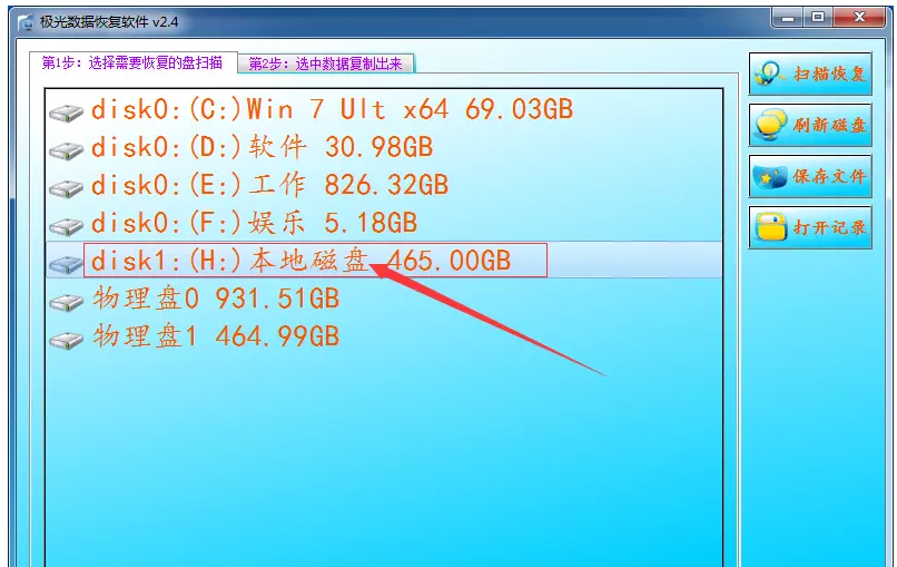首先下载安装极光数据恢复软件,运行软件,如图,选择需要处理的硬盘分区,这里直接双击H盘,