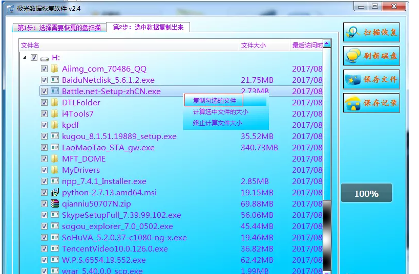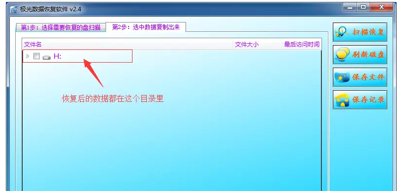 软件即会自动扫描H盘,并将找到的数据保存到《H:》目录,如图,