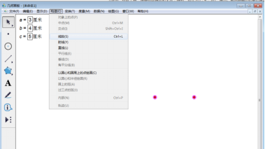 6、选中图板上两点。然后在最上方菜单栏中选择【构造】,在其下拉菜单中选择【线段】,得到长度为3厘米的线段。
