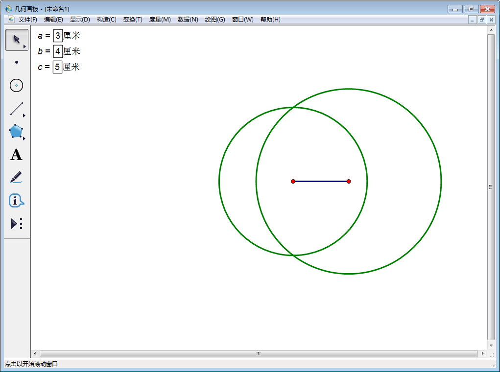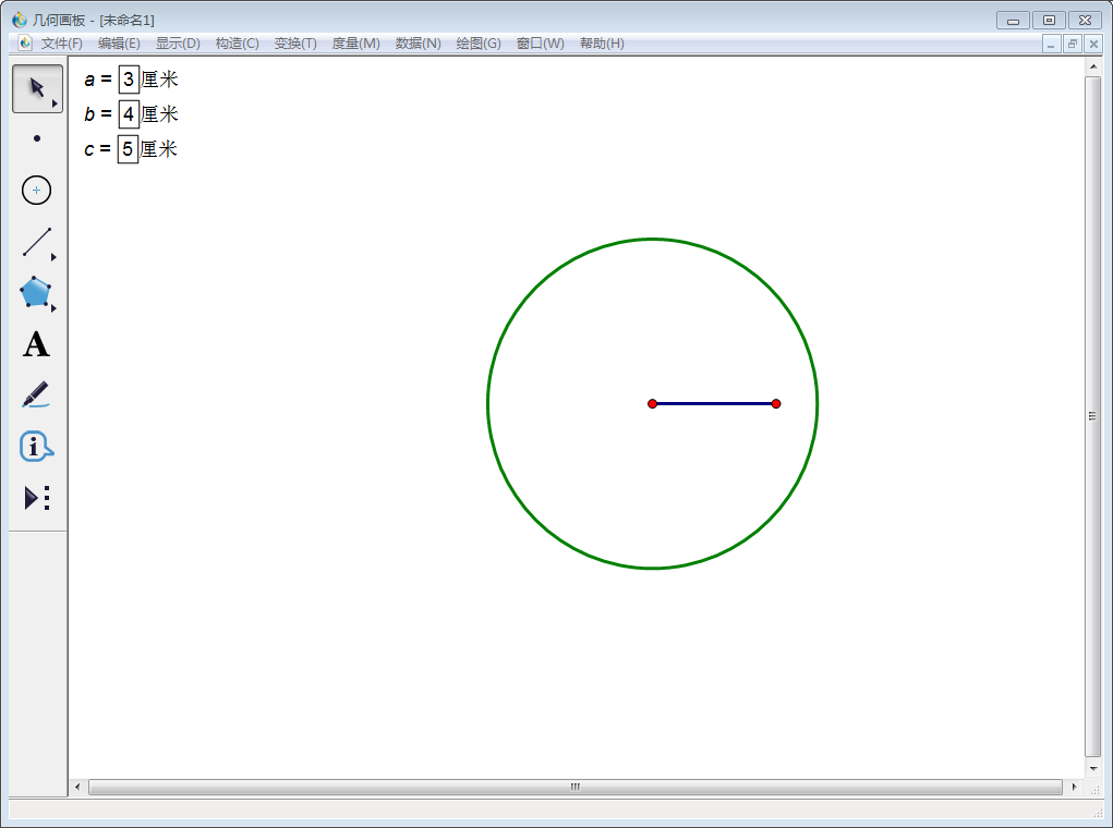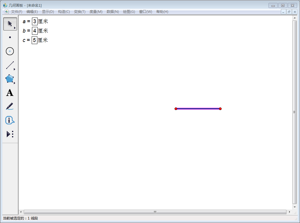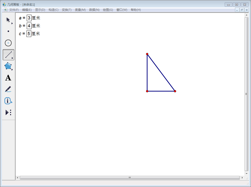 大家都知道,在CAD中可以绘制已知长度的图形,同样在几何画板中也可以实现。为了方便演示,我们假设已知图形为三角形,三条边长度分别为3厘米、4厘米、5厘米,绘制步骤如下: