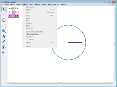 8、同样,选中线段的另一端点和参数c=5厘米,然后在最上方菜单栏中选择【构造】,在其下拉菜单中选择【以圆心和半径绘圆】,得到一个半径为5厘米的圆。