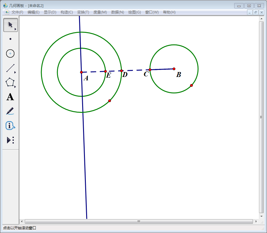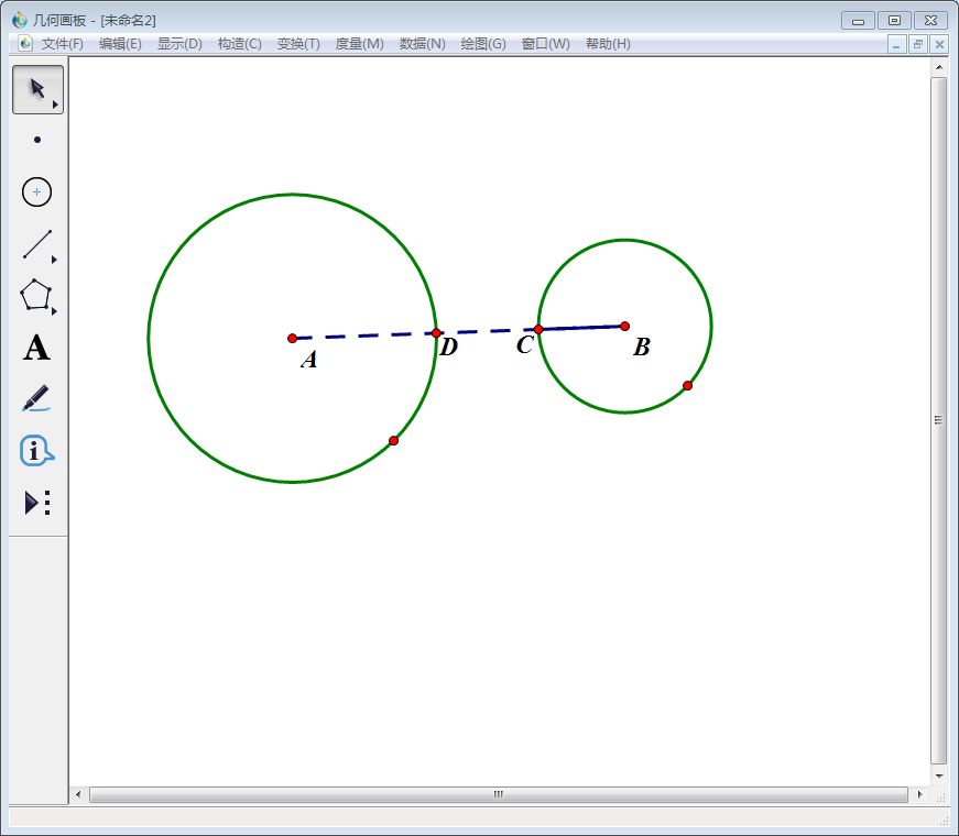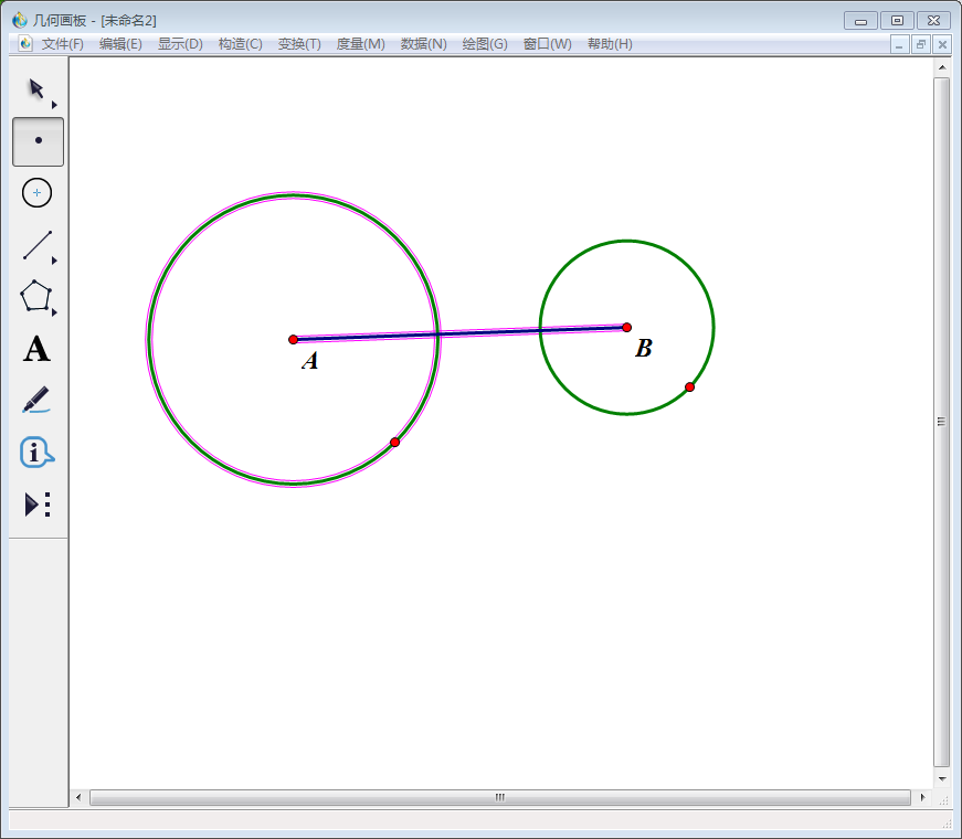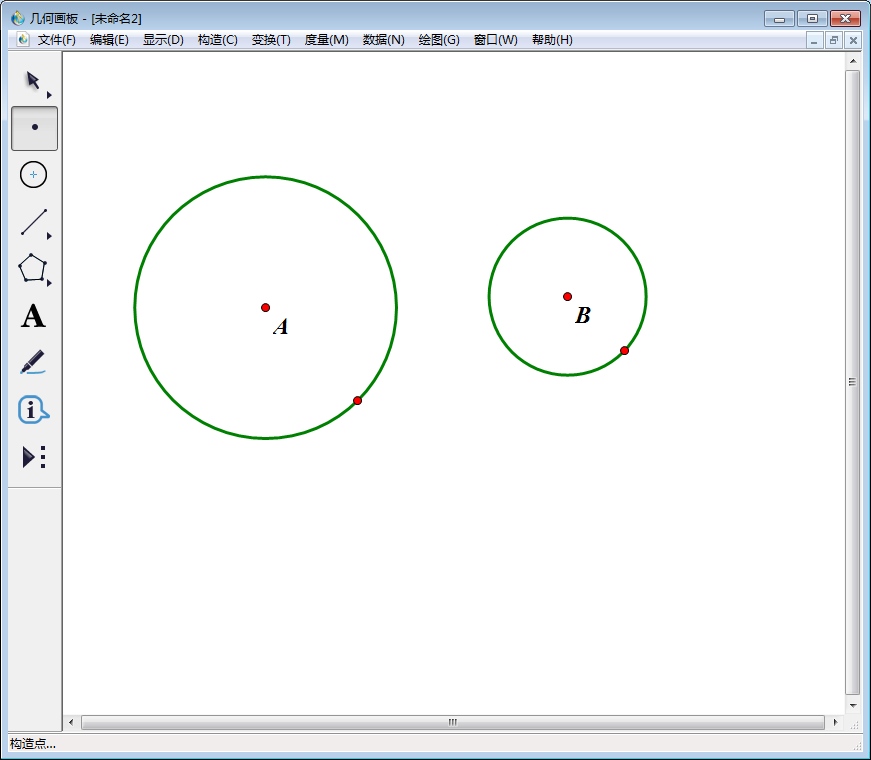 1、打开几何画板软件,选择左侧工具栏中的“圆工具”,绘制两个相离的圆:圆心分别标为A、B。