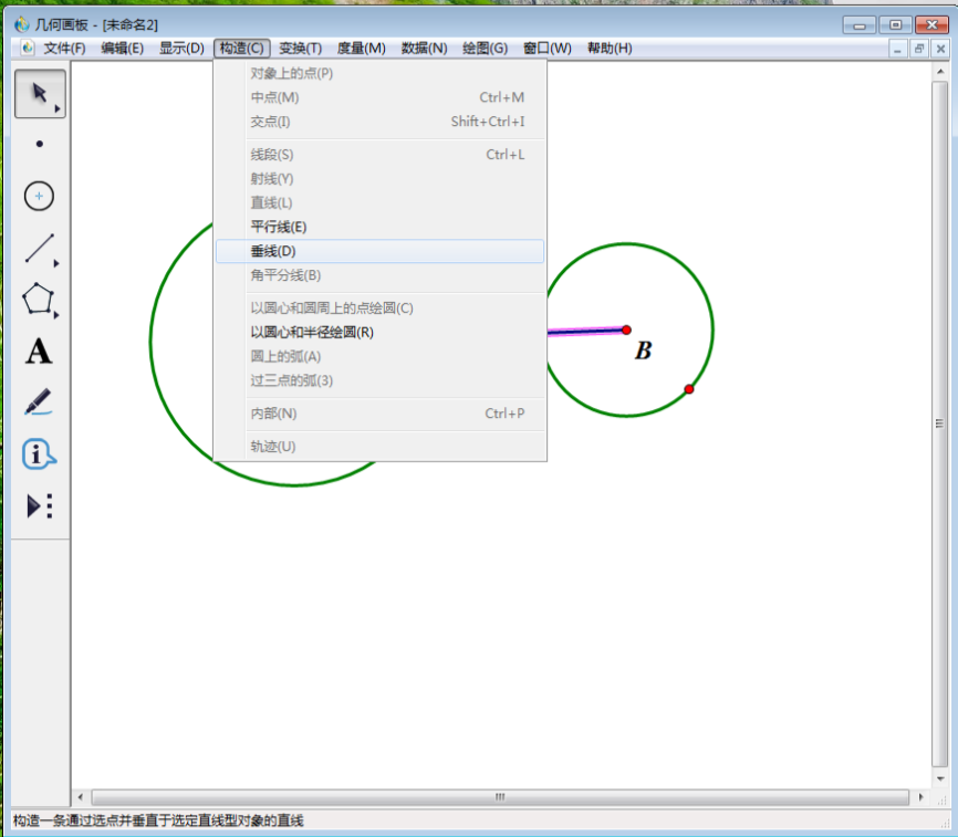 4、使用左侧工具栏中“移动和选择工具”选中点A、线段AB,然后点击上方菜单栏中“构造”,在其下拉菜单中选择“垂线”。
