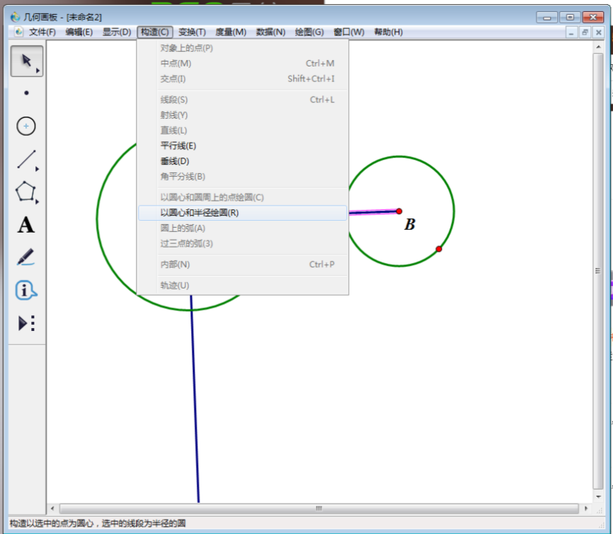 5、再次选中A点及线段BC,然后点击上方菜单栏中“构造”,在其下拉菜单中选择“以圆心和半径绘圆”。