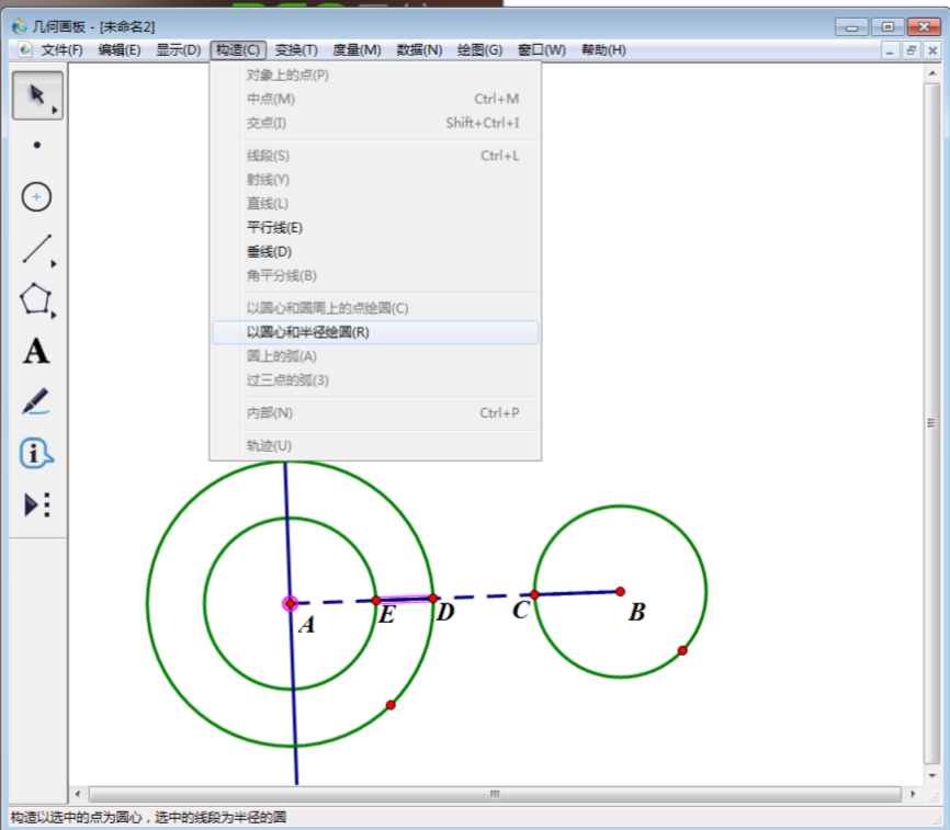 6、使用左侧工具栏中“线段直尺工具”连接DE,使用“移动选择工具”选中A点及线段DE,然后点击上方菜单栏中“构造”,在其下拉菜单中选择“以圆心和半径绘圆”。