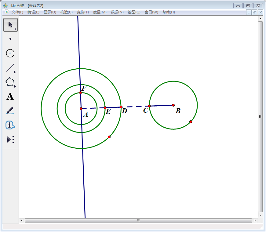 得到A为圆心,DE为半径的新圆,该圆与垂线交点标为F。