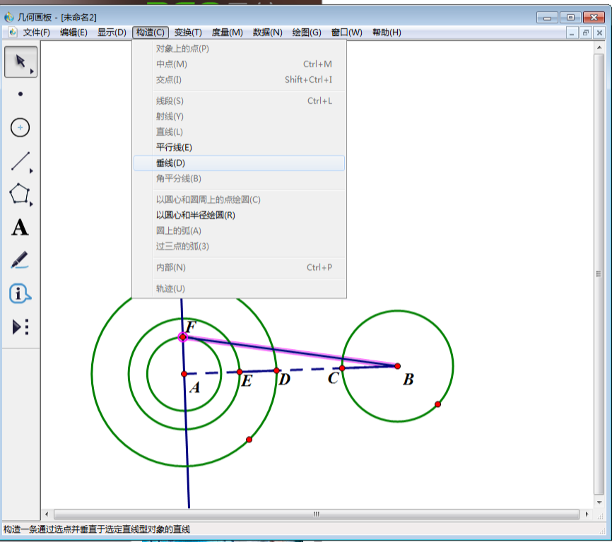 7、使用左侧工具栏中“线段直尺工具”连接BF,然后使用“移动选择工具”选中线段BF和点F,然后点击上方菜单栏中“构造”,在其下拉菜单中选择“垂线”。