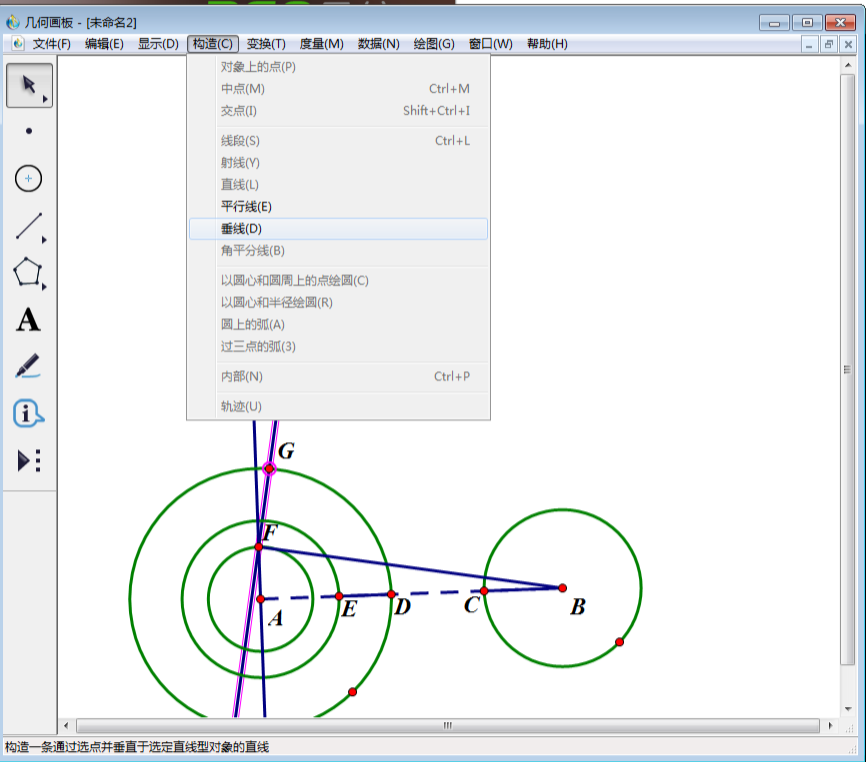 8、使用“移动选择工具”选中过点G的垂线和点G,然后点击上方菜单栏中“构造”,在其下拉菜单中选择“垂线”。