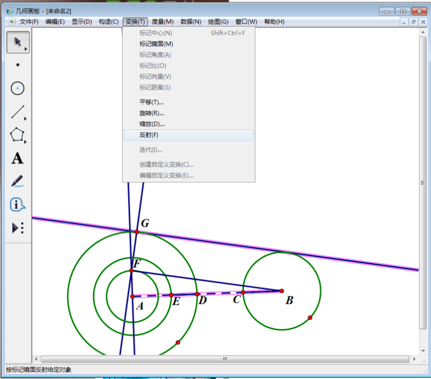 9、双击线段AB将其标记为旋转中心,选中公切线,然后点击上方菜单栏中“变换”,在其下拉菜单中选择“反射”。