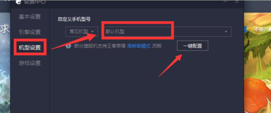 4、为了让腾讯手游助手在使用时更顺畅,在“机型设置”的设置界面中,不要选择高机型,就选择默认的机型,因为有些用户设置了高机型往往会导致卡顿的情况发生。如果机型都不适合,就点击“一键配置”的按钮。