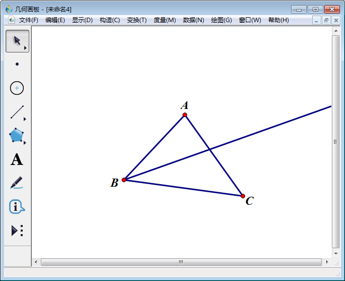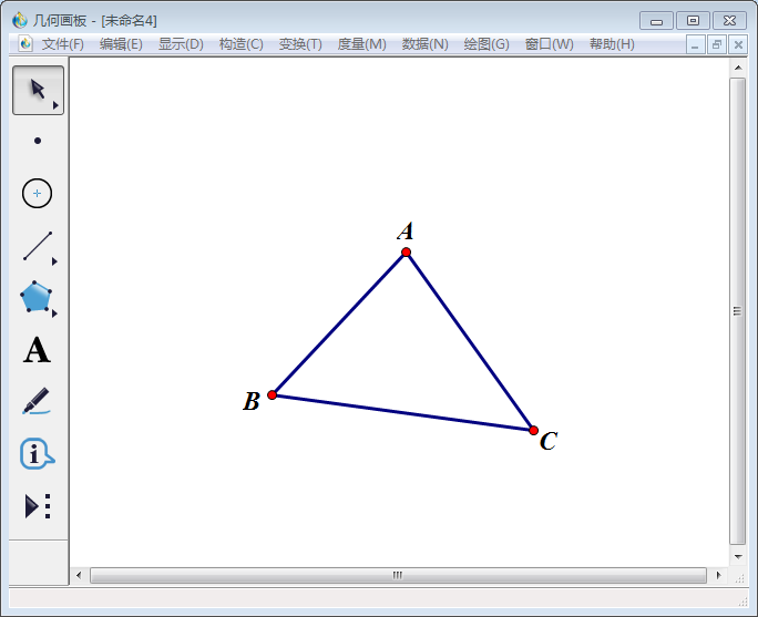 2、在左侧工具栏中选择【线段直尺工具】,任意画一个三角形,使用左侧工具栏中【文本工具】将端点分别标记为A、B、C,得到三角形ABC。
