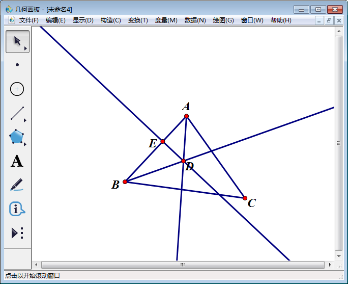 6、使用【移动箭头工具】选中点D和线段AB;然后点击【构造】,在其下拉菜单中选择【垂线】,得到过D点与AB的垂线。使用【点工具】点出垂线与线段AB的相交点,然后【文本工具】将该点标为E。