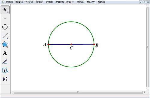 4、使用【移动箭头工具】选中点C、点A,然后点击【构造】,在其下拉菜单中选择【以圆心和圆周上的点绘圆】,得到以C为圆心,直径为AB的圆C。