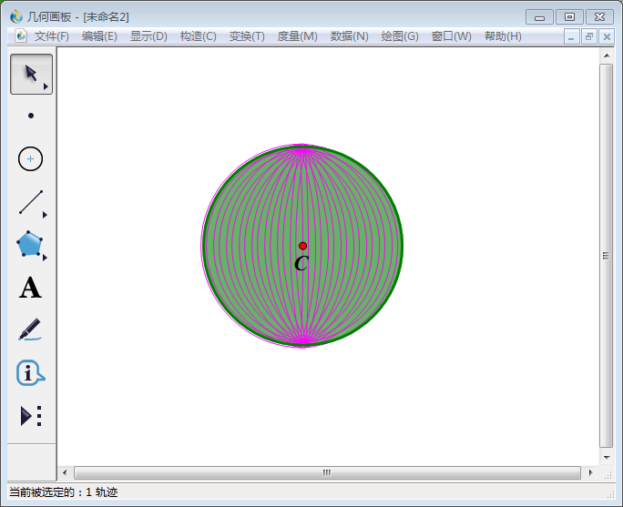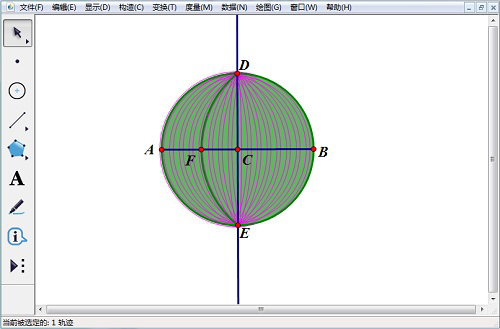 8、使用【移动箭头工具】选中点F、弧DFE,然后点击【构造】,在其下拉菜单中选择【轨迹】,得到无数条端点为DE经过线段AB上任一点的弧线,近似球体。