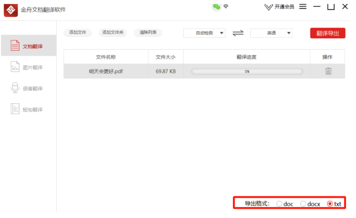 下载安装金舟文档翻译软件,打开软件,注册登录账号,如图,你可以看到四个功能选项,分别是【文档翻译】、【图片翻译】、【语音翻译】、【短句翻译】,