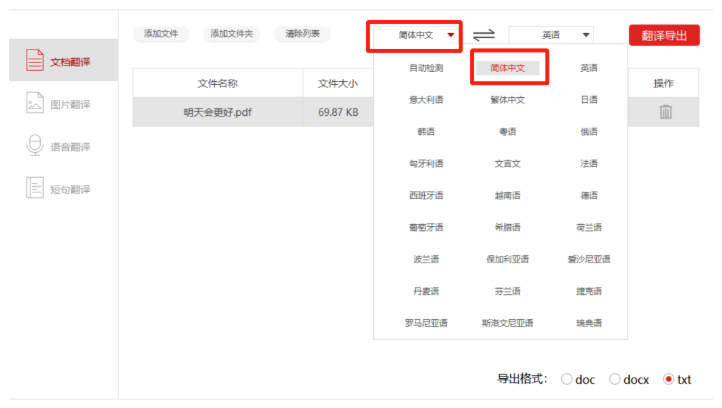如图,在右上方设置文档翻译语言,设置完成,点击【翻译导出】,