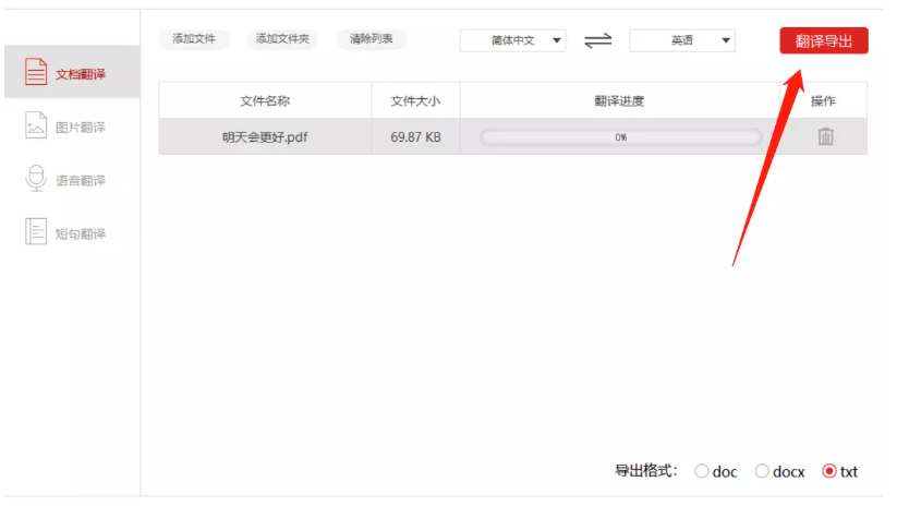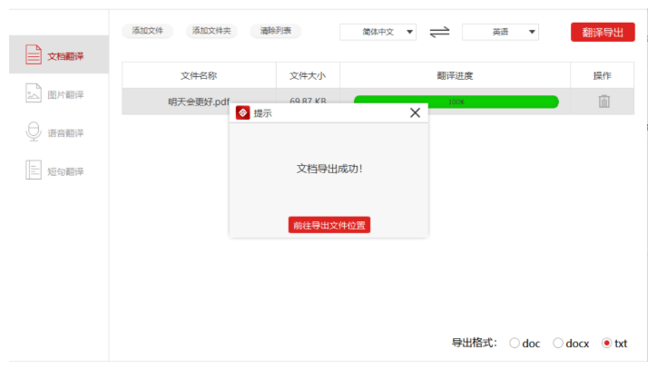翻译完成,出现提示,点击【前往导出文件位置】,即可查看翻译之后的TXT文档。